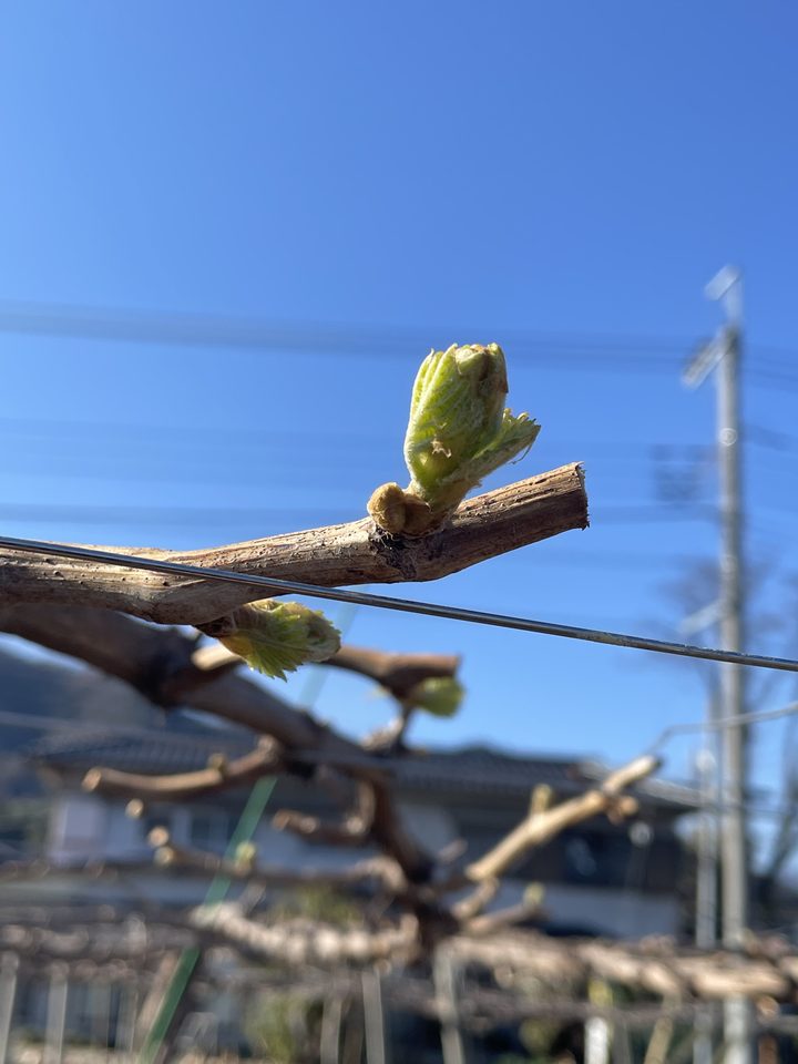 春の日差しに押されて、伸びるぶどうの新芽