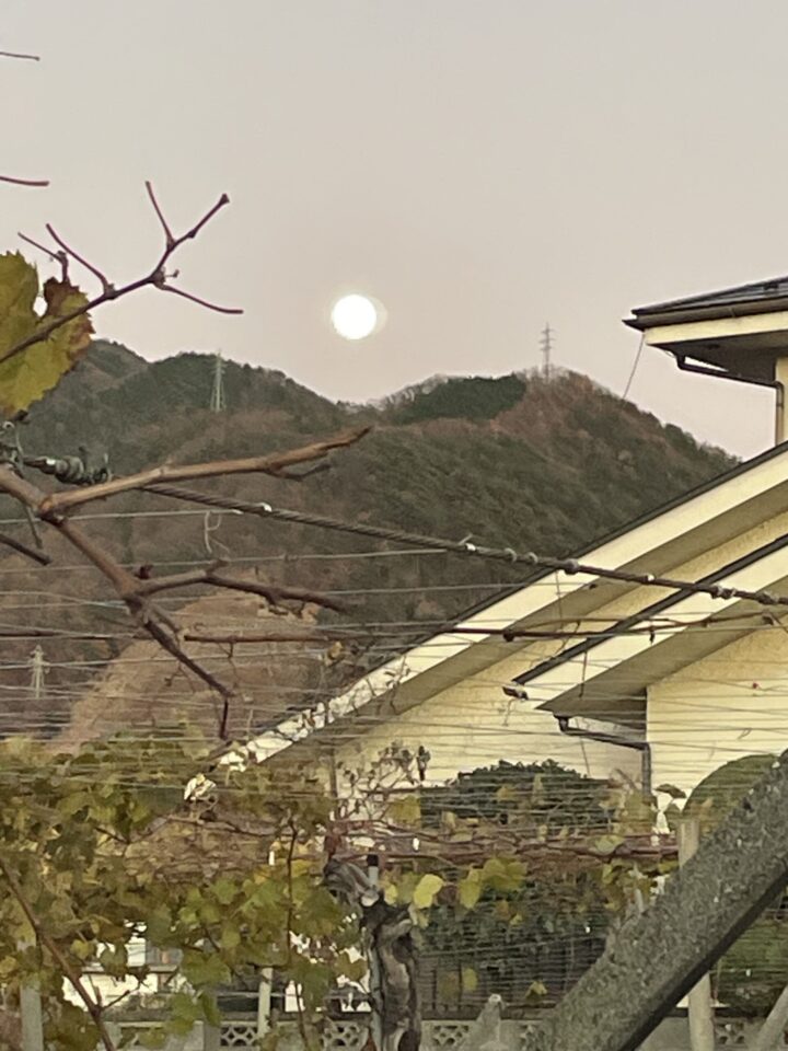ぶどう畑の上に満月 淡い光が畑に降りそそぐ